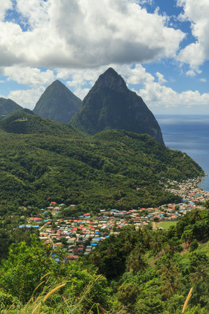 Gros and Petit Pitons near village Soufriere on Caribbean island St Lucia - tropical and paradise landscape scenery on Saint Lucia