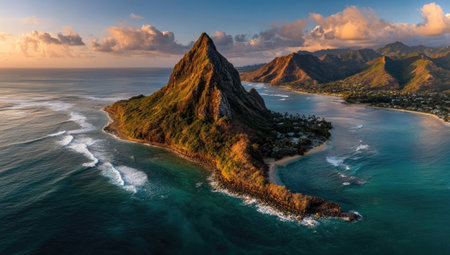 An aerial view presents a rugged mountain island rising from the sea, surrounded by breaking waves and calm waters. The composition features a vibrant sky with soft clouds, suggesting a sunset or sunrise. The image showcases natural textures and a color palette of blues, greens, and golden hues, ideal for travel, environmental, or scenic themes.