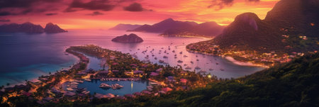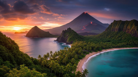 A vibrant sunset illuminates a tropical island with a volcano in the distance. The image features a coastline, dense green vegetation, and a sandy beach. Warm colors dominate the sky, contrasting with the cool tones of the water and foliage. This scene is suitable for various commercial uses, including travel and nature themes.