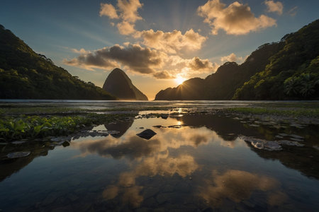 Towering mountains covered in lush greenery rise majestically under a partly cloudy sky, capturing the essence of untouched natural beauty at sunset.