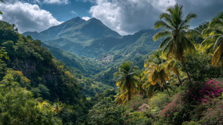 A rich green valley surrounded by towering mountains showcases a variety of palm trees and flowering plants. The sky is filled with clouds, creating a serene afternoon scene.