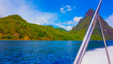 Caribbean Sea native fishing boat with view twin piton peaks and volcano mountains Soufriere St. Lucia island West Indies
