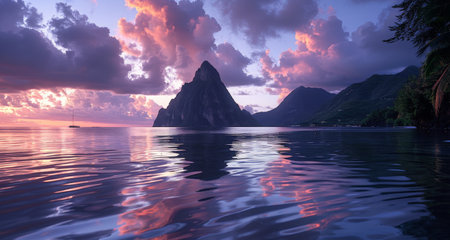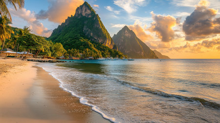 Calm Caribbean sea gently lapping against the shore, with the majestic Pitons of St. Lucia rising dramatically above the water at sunset