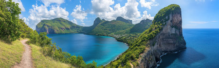Explore the stunning Caravelle Peninsula with its rugged cliffs, vibrant vegetation, and a winding trail leading to panoramic vistas over the turquoise sea in Martinique.