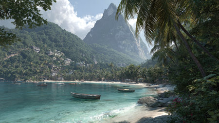A scenic coastal view features calm turquoise water, a sandy beach, and lush green trees. Majestic mountains rise in the background beneath a partly cloudy sky. Two small boats rest near the shore. This image can be used for travel, nature, or environmental related projects.