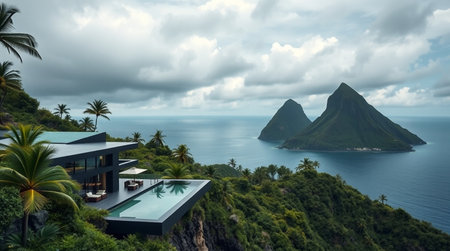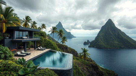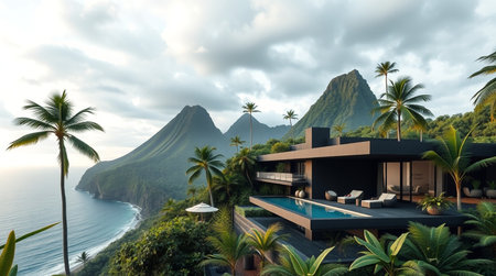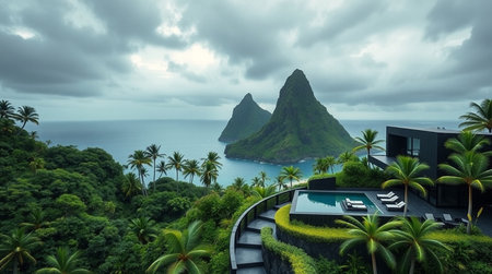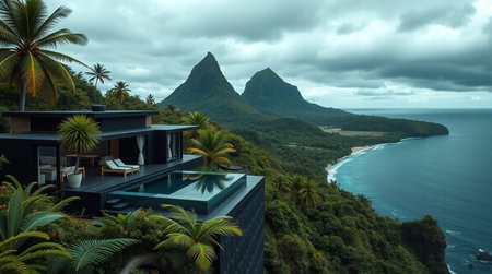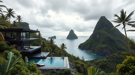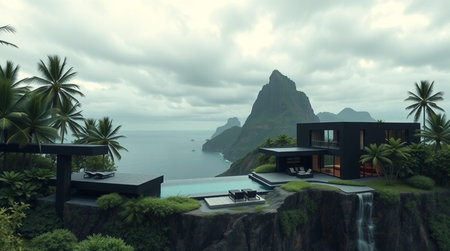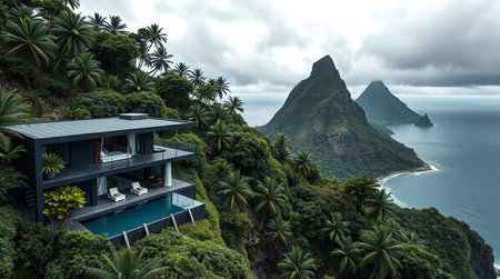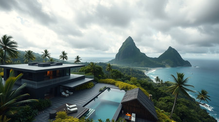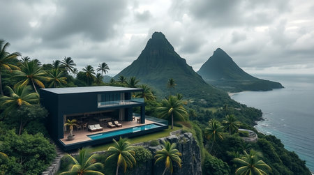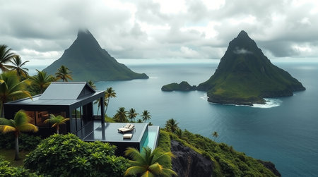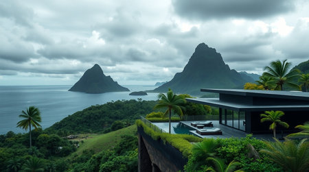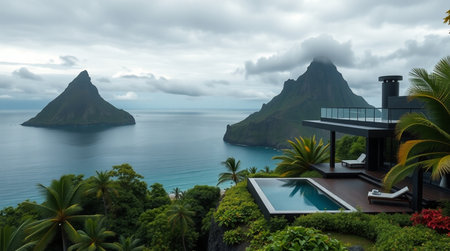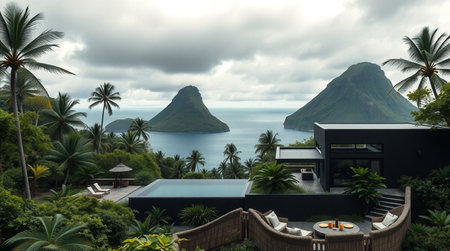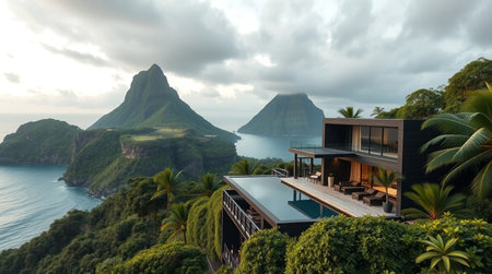 Panoramic view of a villa on a tropical island.