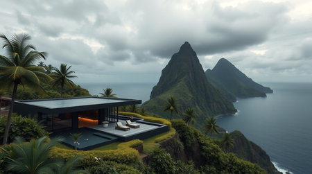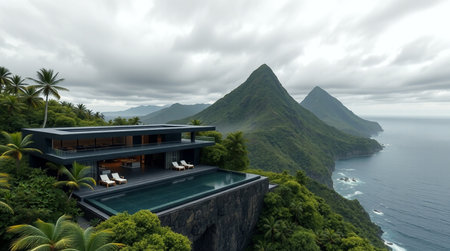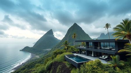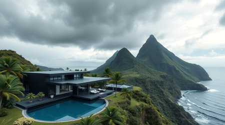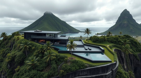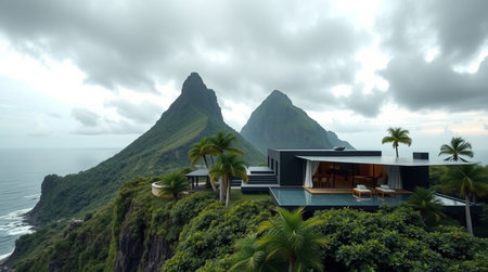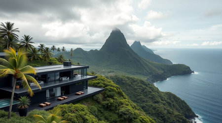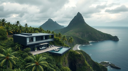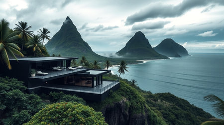 View of a mountain landscape with a modern house overlooking the ocean.