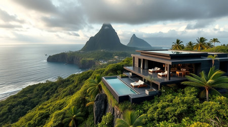 Luxury villa on the beach with mountains in the background