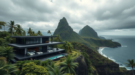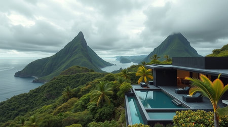 An aerial view captures a vibrant green island rising from tranquil waters. The imposing mountain range dominates the composition, while the surrounding sea reflects the overcast sky. The image uses dramatic lighting, creating a sense of scale and visual depth. Suitable for editorial and commercial applications.