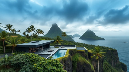 Panoramic view of luxury villa with swimming pool in tropical island.