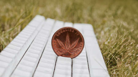 Brass cannabis sativa coin on the white keyboard in garden. Green concept.