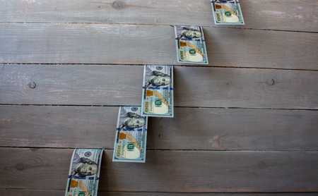 one hundred dollars bills on wooden background