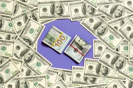 Frame of one hundred dollar bills with stack of money in the middle. Top view of business concept on purple background with copy space.