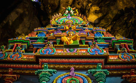 Gombak, Malaysia - January 4, 2020: Beautiful and colorful architectural building inside the Batu Caves. Statue of Hindu God in Batu caves Indian Temple, Kuala Lumpur. Image contain bit out of focus.