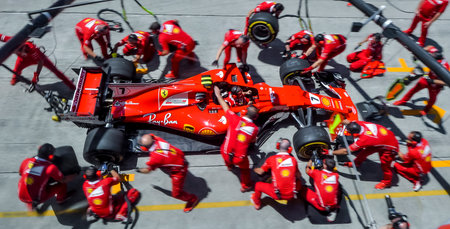 Formula One pit stop, changing tires to improve speed on a race track. Formula One is the highest class of international racing for open-wheel single-seater formula racing cars.