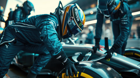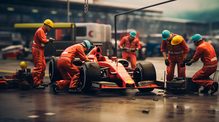High octane formula 1 pit stop maintenance with swift team performing car maintenance