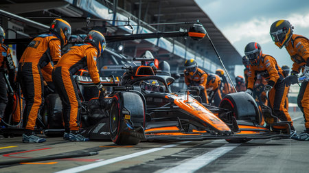 Professional pit crew in action with race car in pit lane, ultimate teamwork concept