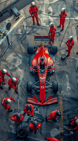 Experience the thrill of a high-speed Formula One pit stop, capturing the intensity and teamwork of mechanics as they change tires and service the car.