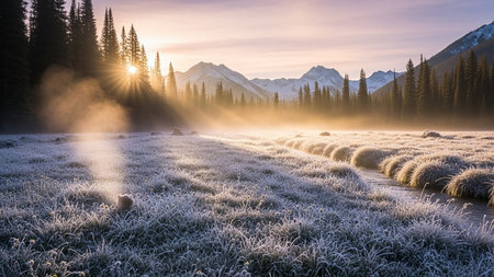 A frosty meadow is bathed in the warm glow of sunrise, with sun rays piercing through silhouetted trees and mist rising from the ground.