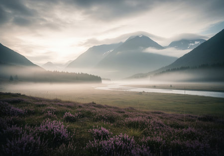 A serene and atmospheric view of a mountain valley covered in thick morning mist, featuring purple heather in the foreground and a winding river leading toward the distant peaks.