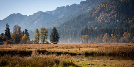 Thick mist drapes the golden-green expanse of Spruce Meadow in autumn.