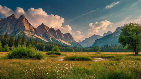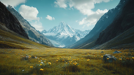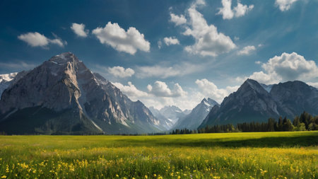 Scenic Alpine view with blooming meadows and snow-capped peaks. Copy space available for branding