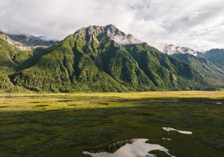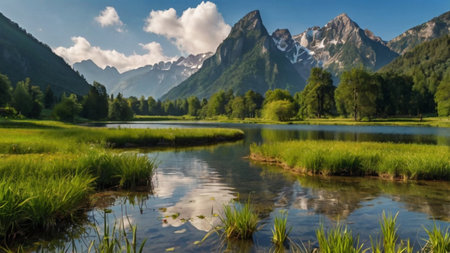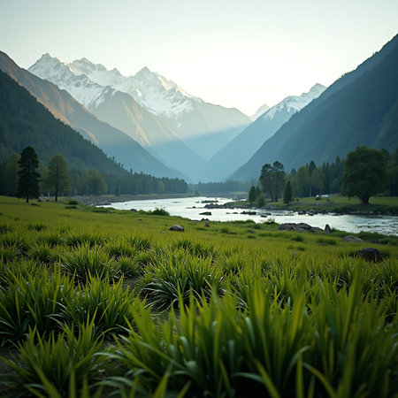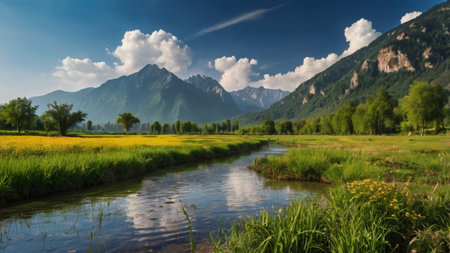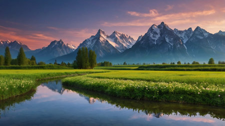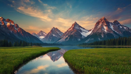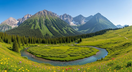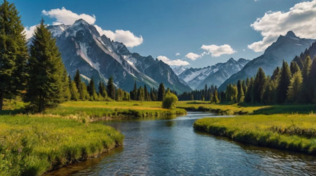 Serene mountain river winds through a lush green valley with snowcapped peaks in the distance Great for nature and landscape projects.
