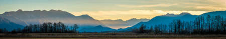 Panoramic view of alps and meadow at sunset.