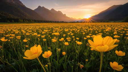 Sunset over a field of buttercups in the Swiss Alps