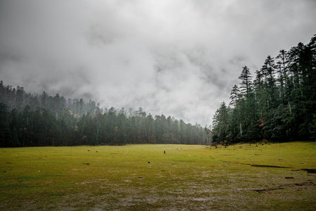 The vast grasslands in the mountains and forests and the gloomy sky