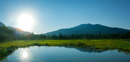 Panoramic view of alpine meadow and mountain river.