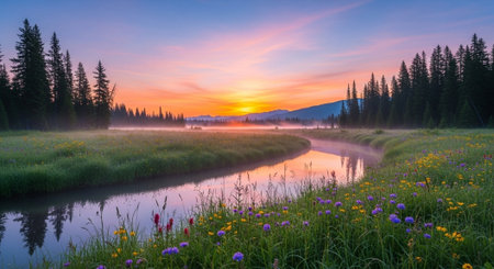 Picturesque mountain river landscape at sunrise with flower meadow