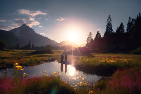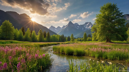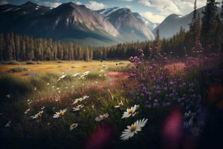 Colorful wildflowers flourish in a sun-drenched meadow, creating a peaceful atmosphere. Majestic mountains rise in the distance, illuminating the beauty of nature in full bloom.