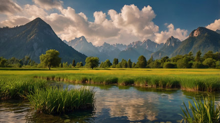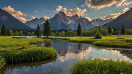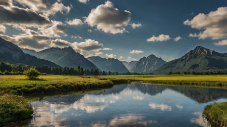Beautiful alpine landscape with river and mountains in the background.