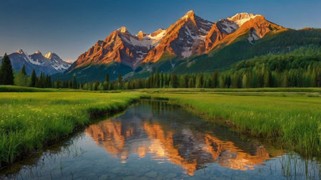 Scenic mountain range landscape with river and colorful meadow