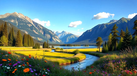 A breathtaking view of a lush alpine meadow filled with a variety of colorful wildflowers. The meadow is surrounded by majestic snow-capped mountains and a clear, winding stream. The scene is vibrant and serene, capturing the natural beauty of the high-altitude landscape.