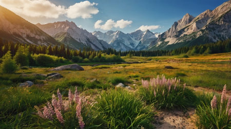 Panoramic view of beautiful alpine meadow with wildflowers and mountains in background