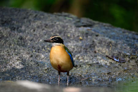 Colorful green Pitta, Hooded Pitta (Pitta sordida), standing on the rock