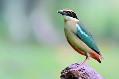 proud green wings with red belly and pale chest bird, straight standing on stump, fairy pitta when migrate to Bangkok city garden