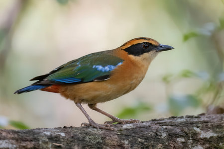 Beautiful colorful bird, Female of Malayan Banded Pitta (Pitta irena) standing on the log, southern of Thailand.