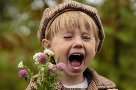 Excited kid. Adorable boy spring garden. International childrens day. Happy childhood. Healthy child. Child care. Celebrate summer holidays. Boy nature background. Child development. Happiness