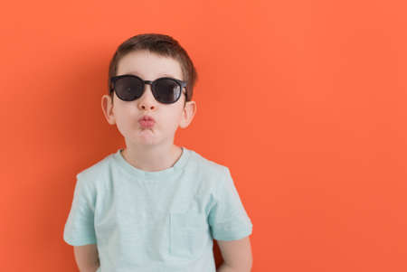 Caucasian boy in black sunglasses on an orange background, copy space. Summer concept, child in sunglasses