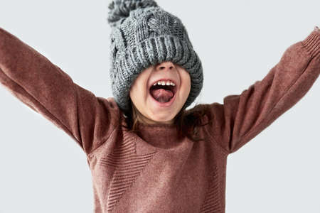 Happy funny little girl hidden the eyes in winter warm gray hat, joyful smiling with hands wide open and wearing sweater isolated on a white studio background.