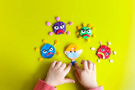 Viral epidemic influenza and Coronavirus. Clay characters on yellow background with hands of the kid. Corona virus, covid-19. Care and save concept