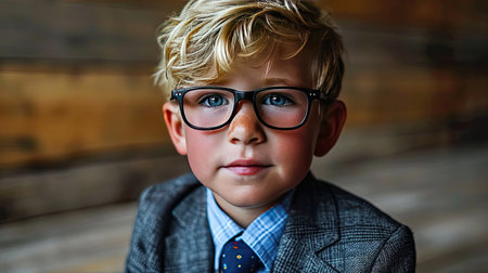 Portrait of a little Caucasian boy in a stylish formal suit with glasses. Modern stylish portrait over bricks wall with fashion magazine style. Photo with copy space for your text.