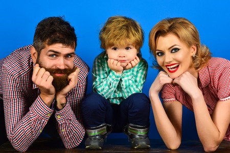 Family, children and people concept - smiling happy parents and kid in checkered clothes. Happy family - father, mother, cute little boy at home. Family lifestyle portrait. Mum and dad with their son.