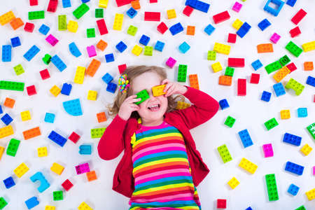 Child playing with colorful toys. Little girl with educational toy blocks. Children play at day care or preschool. Mess in kids room. View from above.