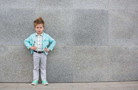 Fashion baby boy in mint jacket and sneakers posing on a gray wall background. Trendy boy standing on the street.
