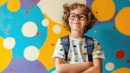 Portrait of smiling boy in eyeglasses with backpack standing with crossed arms on colorful background. Education concept