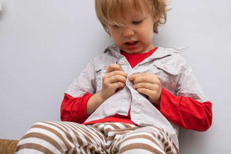 Childhood independence concept ,little boy buttoning on shirt, fastening his buttons , on white gray background. The child puts on his own clothes.